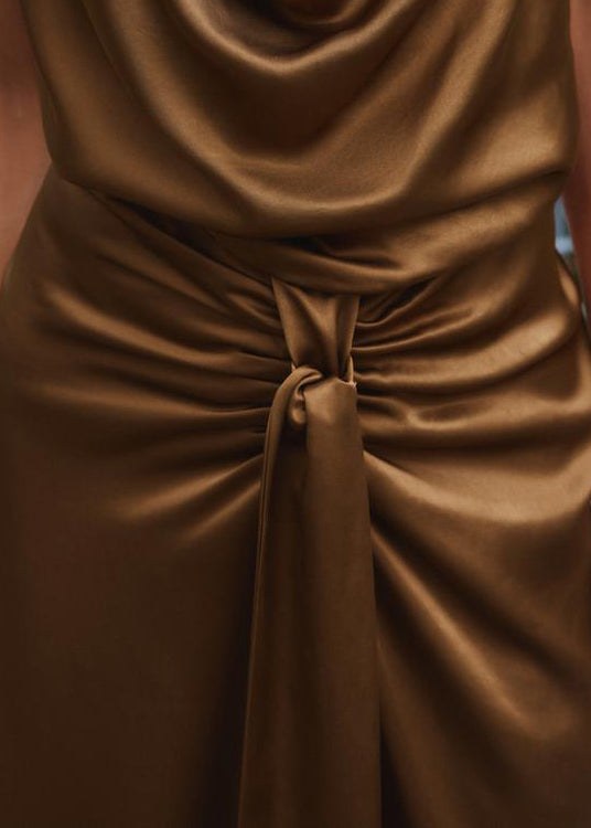 Slim Fit Brown Backless Wrinkled Side Open Silk Long Dress Sleeveless