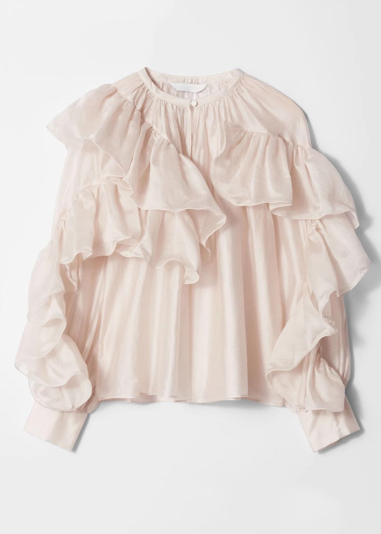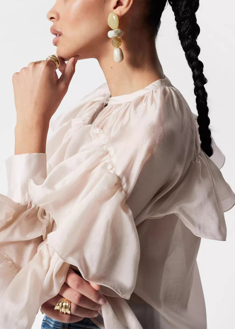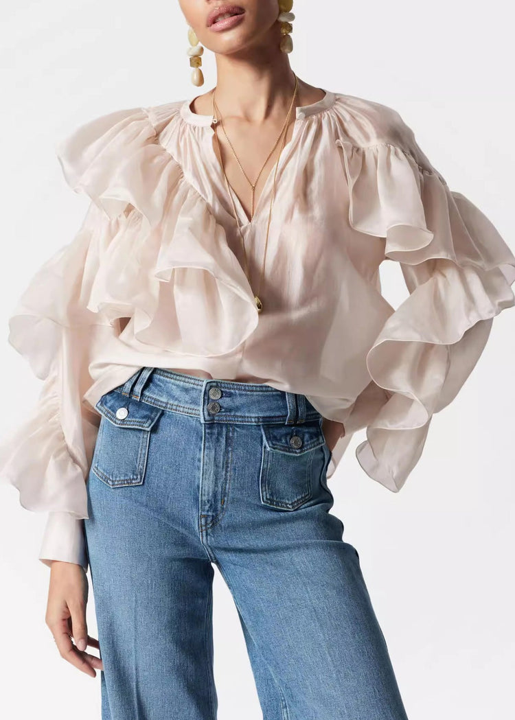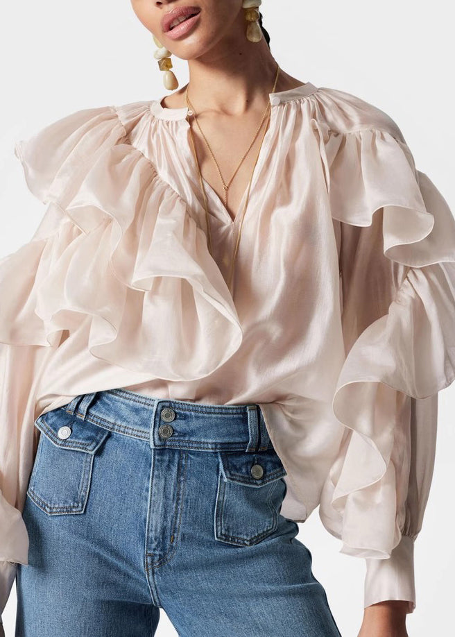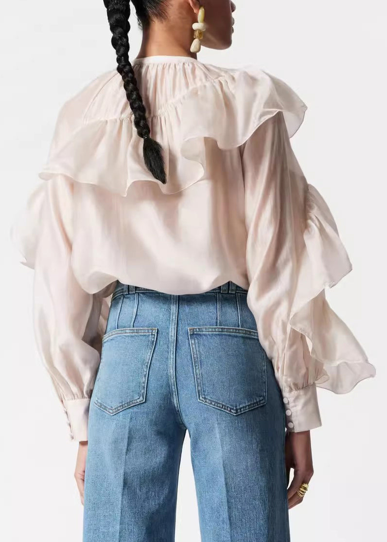 Stylish O-Neck Ruffled Solid Silk Shirts Fall