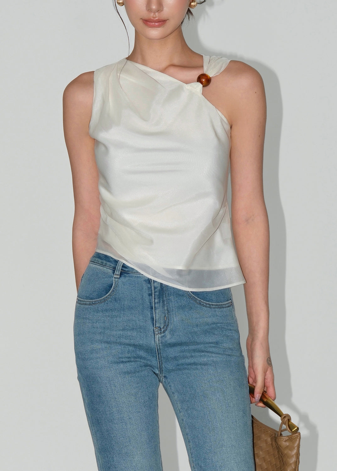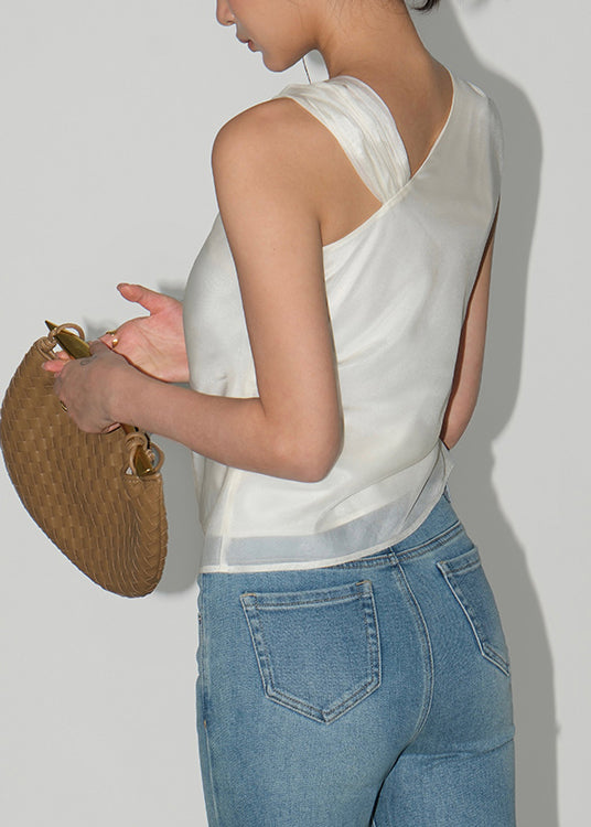Women Apricot Asymmetrical Design Silk Top Sleeveless