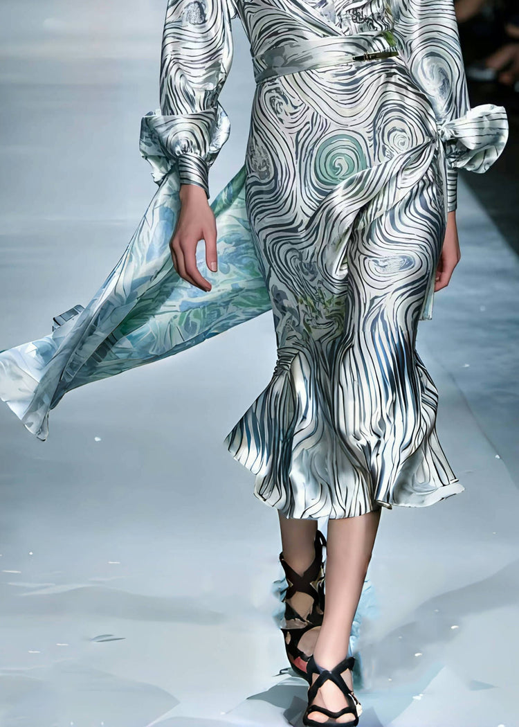 Women Grey Asymmetrical Striped Silk Robe Dresses Spring