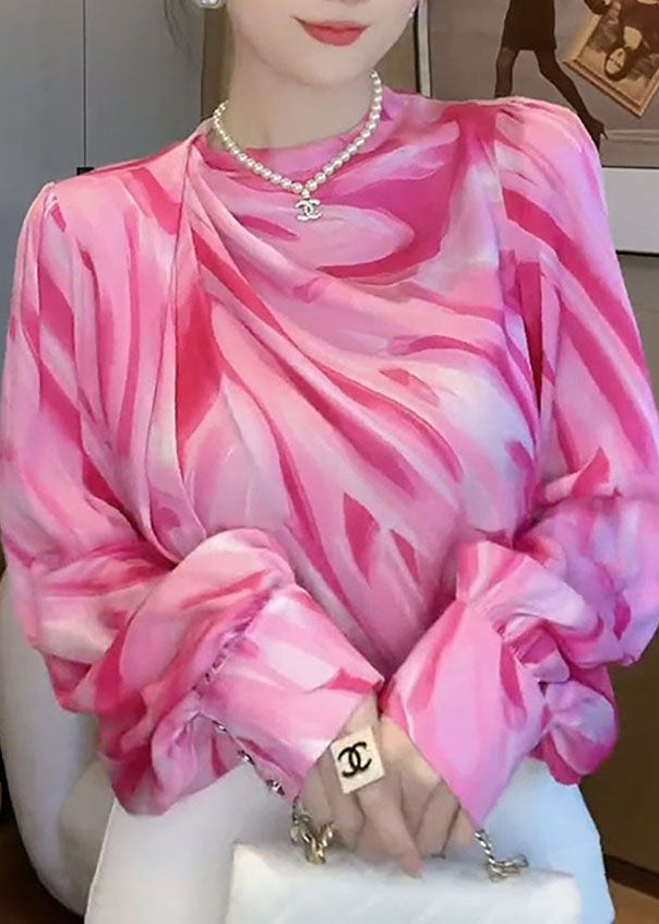 Women Pink V Neck Wrinkled Patchwork Print Silk Shirts Top Spring