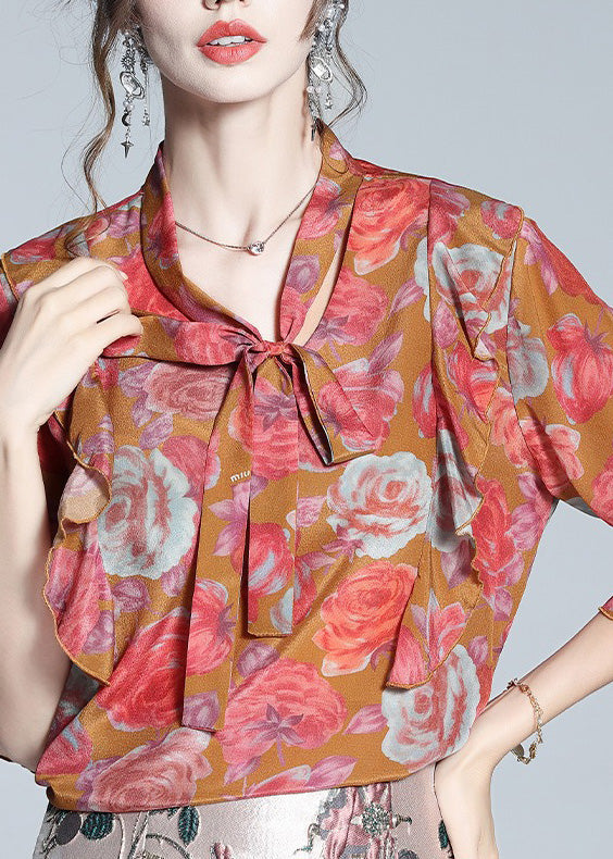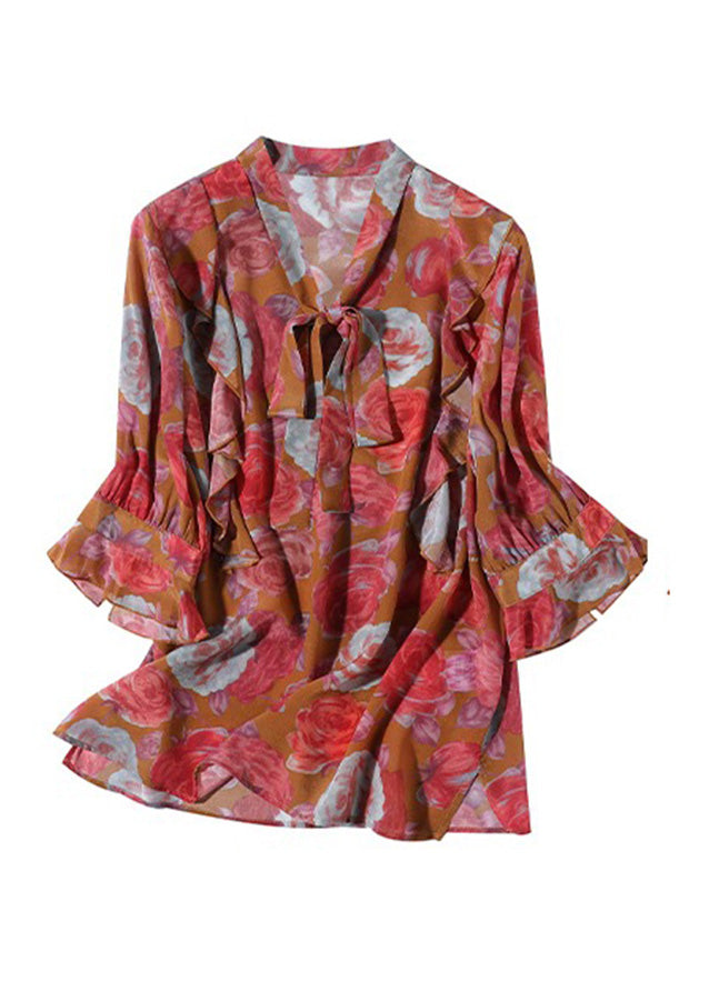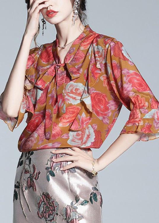 Women Red V Neck Print Bow Silk Shirt Half Sleeve