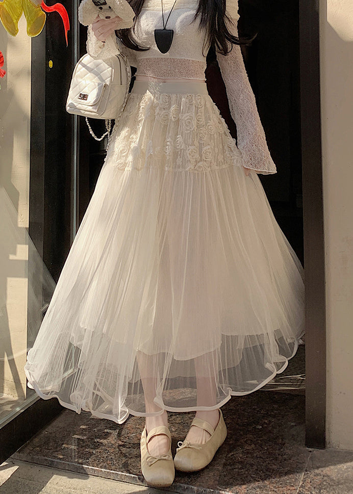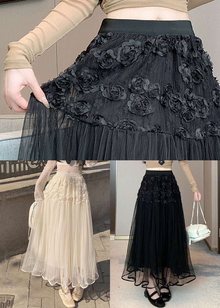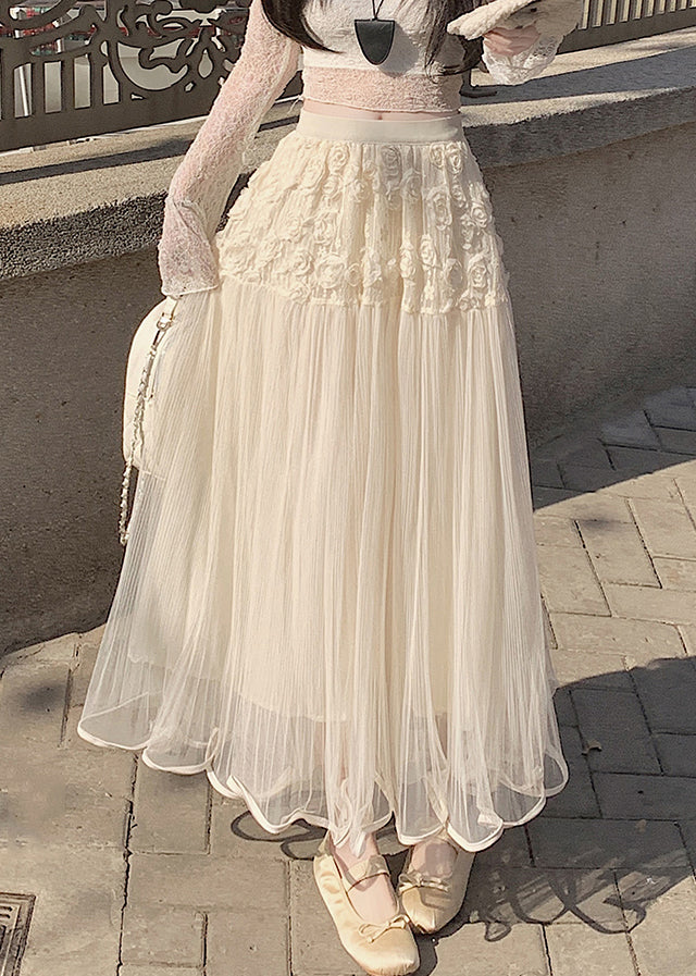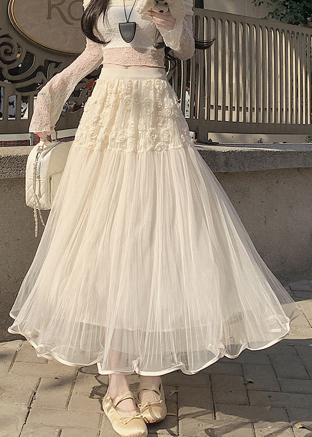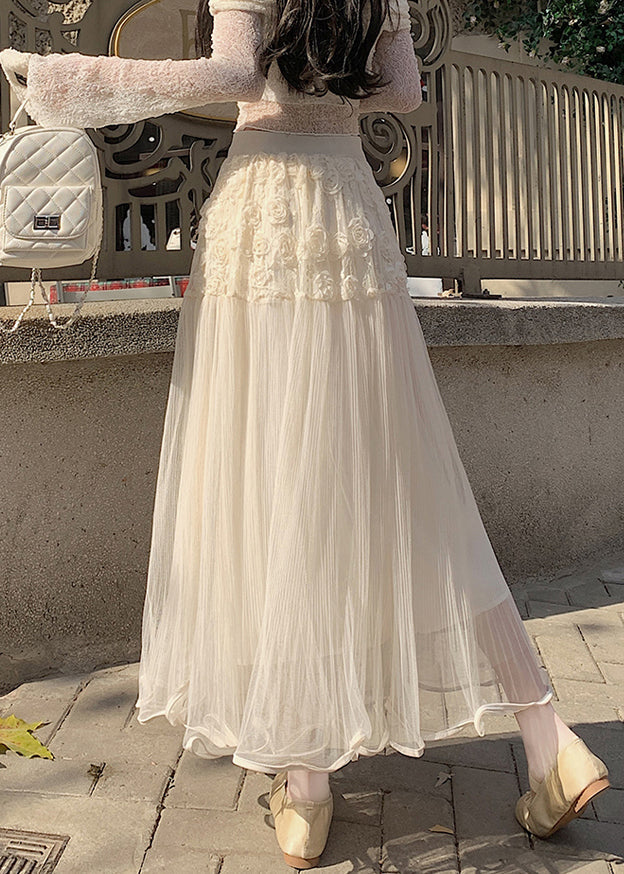 Beautiful Beige Floral Elastic Waist Tulle Skirt Summer