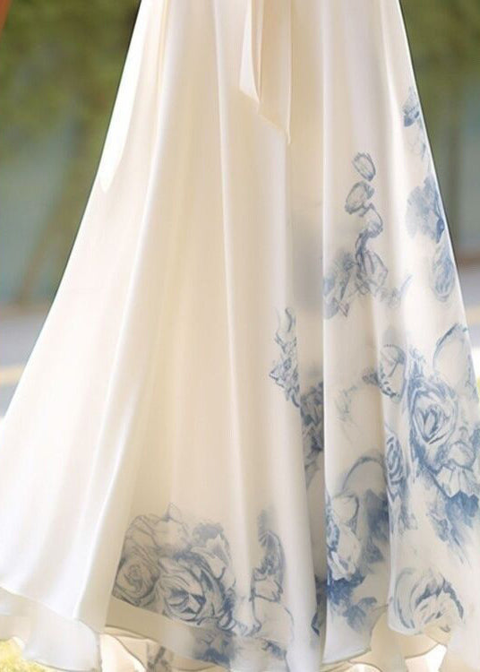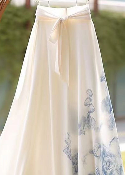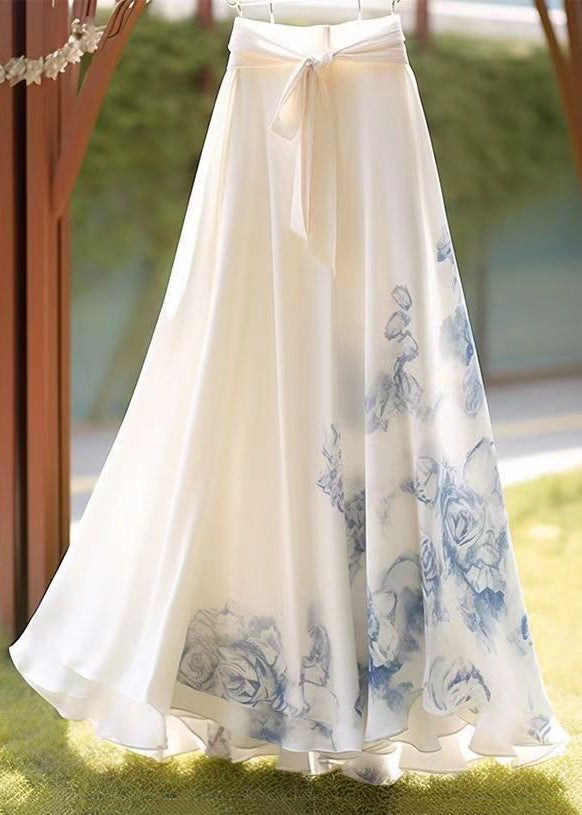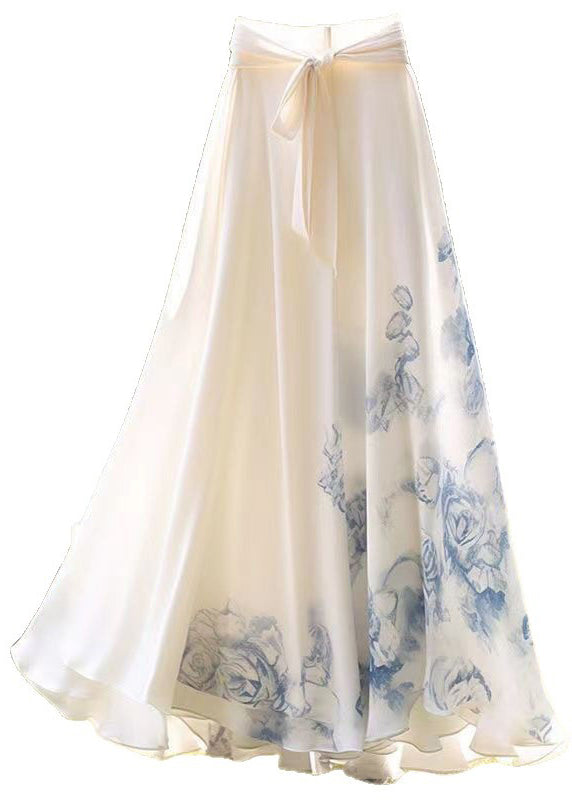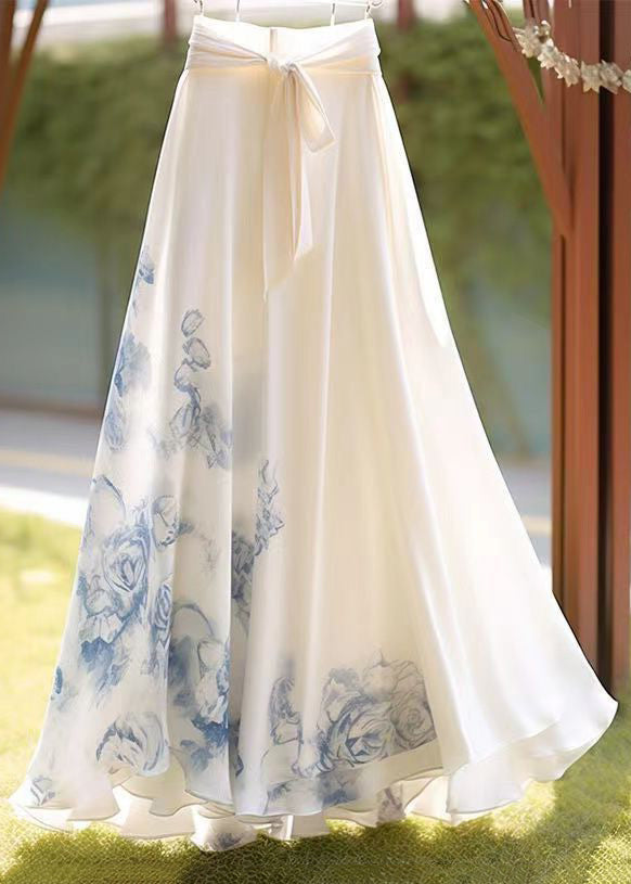 New White Print Lace Up Chiffon Maxi Skirts Summer