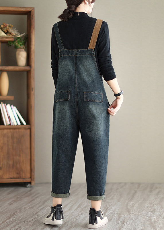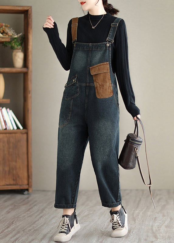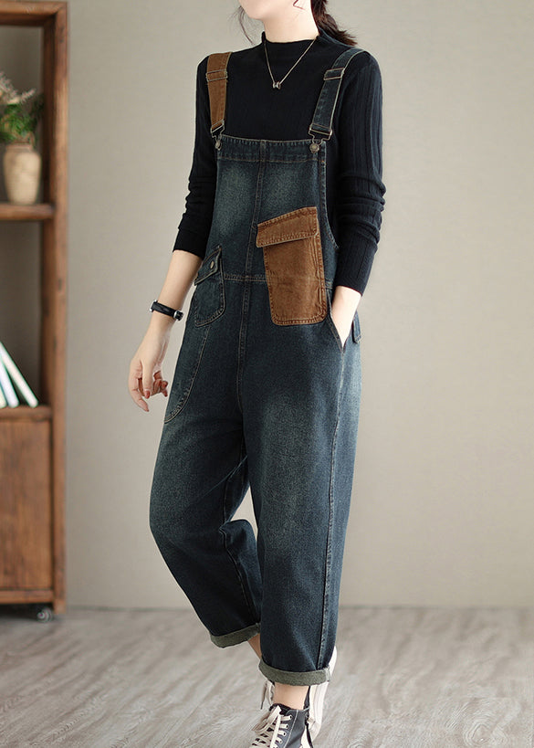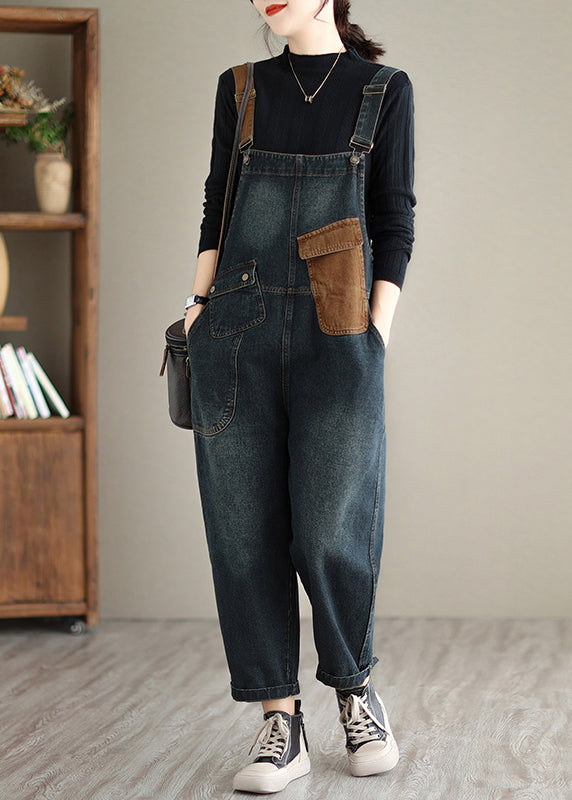 Casual Dark Blue Pockets Patchwork Denim Jumpsuits Spring