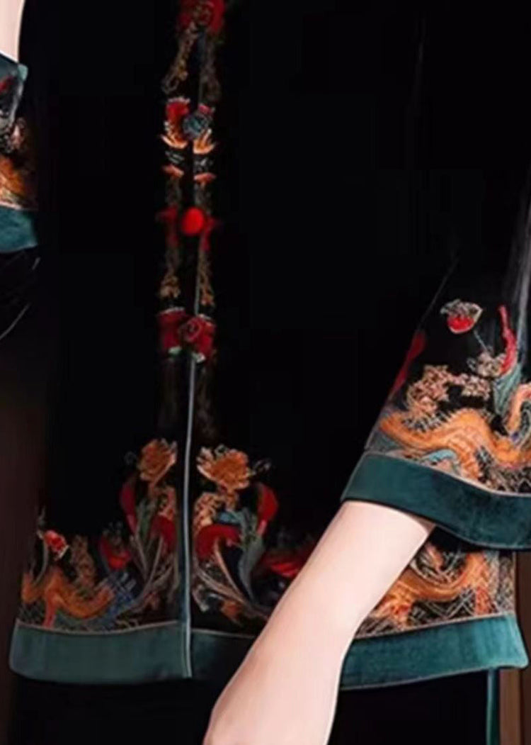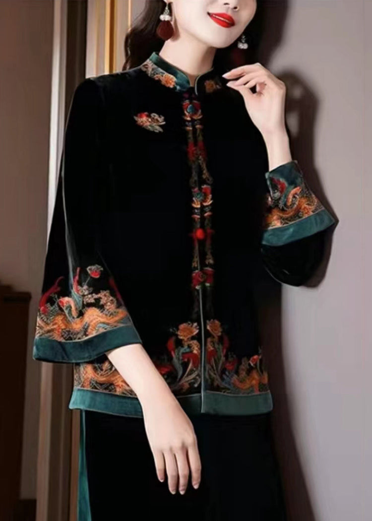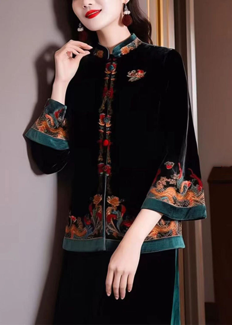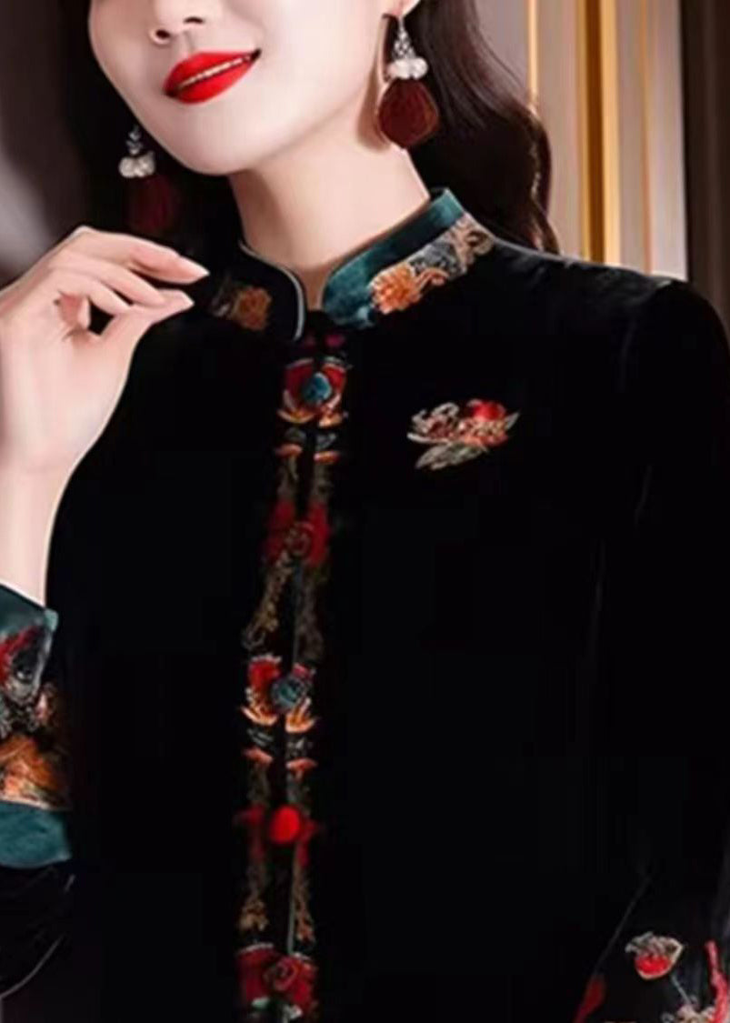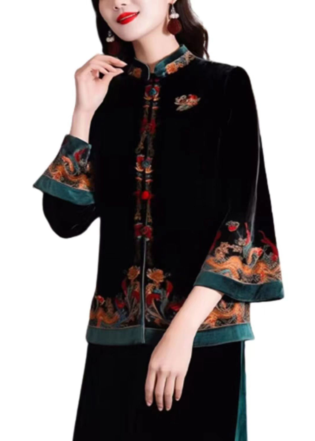 New Black Stand Collar Embroidered Button Silk Coats Fall