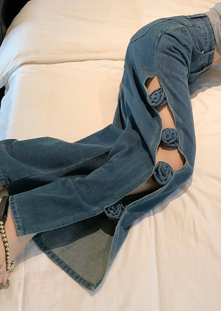 Original Design Blue Hollow Out Floral Denim Pants Fall
