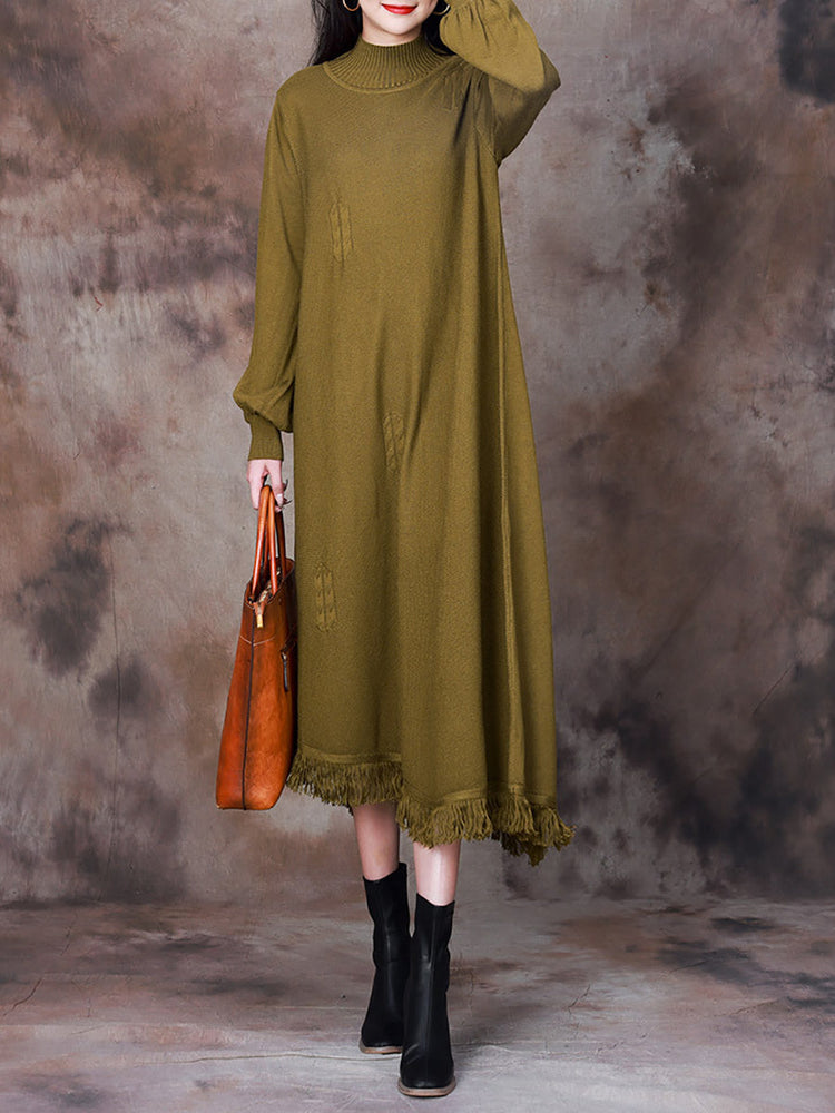 Women Elegant Solid Tassel Hem Knitted Long Dress