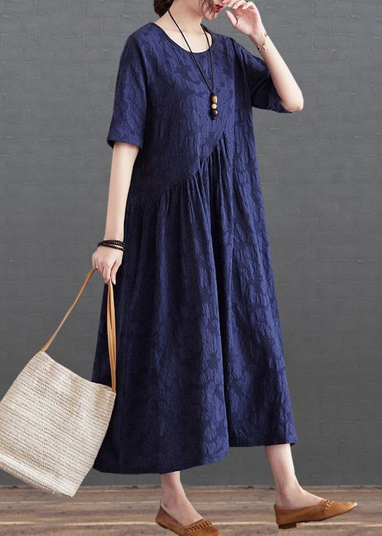 French Navy O-Neck Patchwork Wrinkled Cotton Long Dress Summer