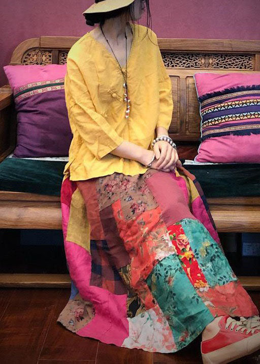Bohemian Colorblock Wrinkled Pockets Patchwork Linen Skirts Spring