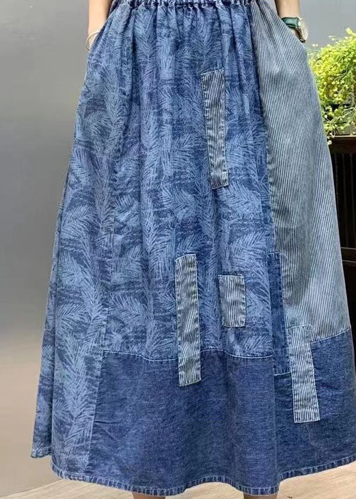 Retro Blue Wrinkled Pockets Print Patchwork Denim Skirts Summer