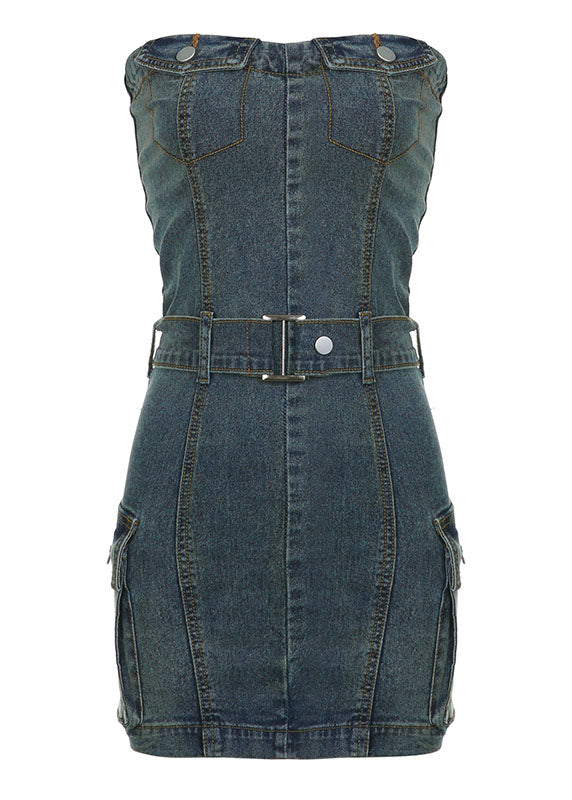 Sexy Blue Strapless Tie Waist Patchwork Denim Mini Dress Summer
