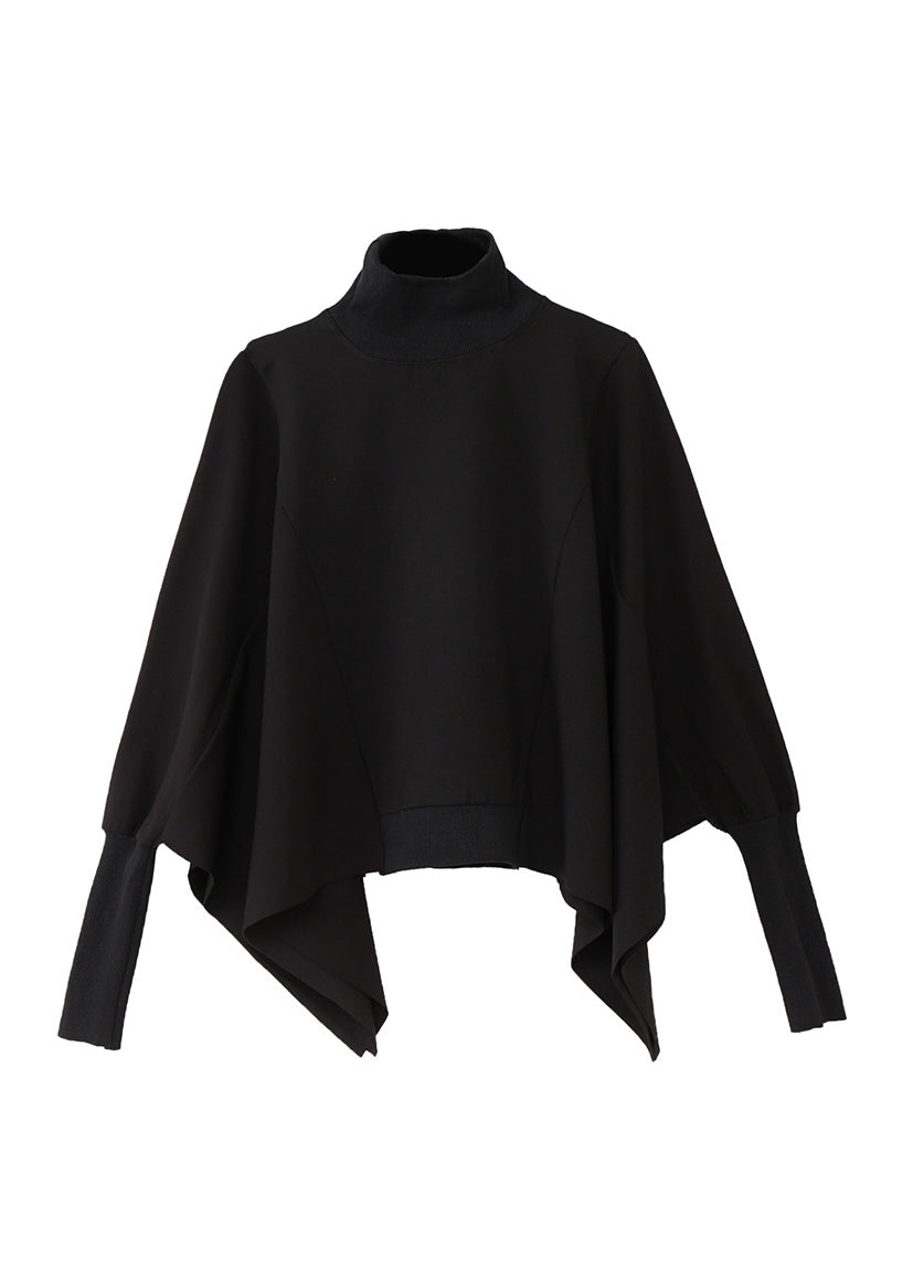 Handmade Black Turtleneck Asymmetrical Patchwork Zippered Low High Design Sweatshirts Batwing Sleeve