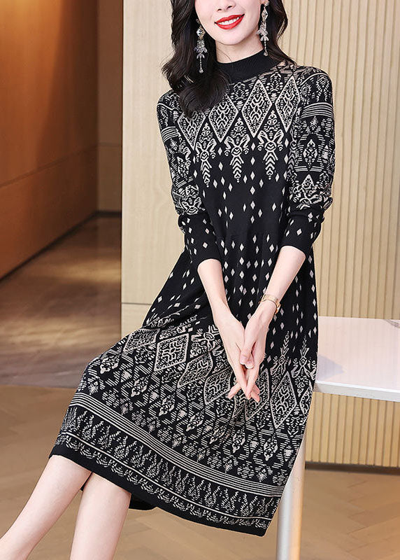 Women Dark Coffee High Neck Jacquard Knit Long Sweater Winter