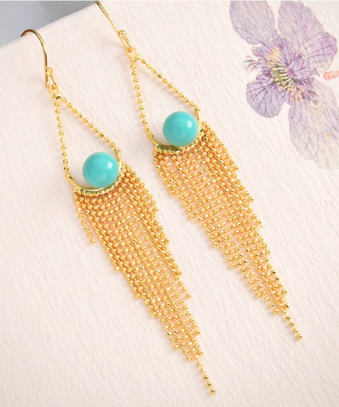 Unique Cyan Sterling Silver Overgild Jade Dragonfly Tassel Drop Earrings