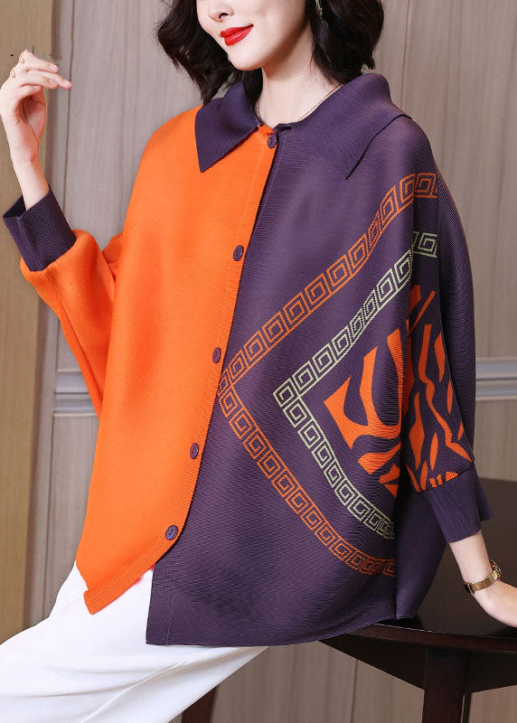 Chic Orange Peter Pan Collar Print Button Shirt Long Sleeve