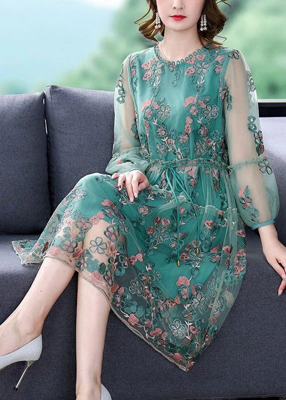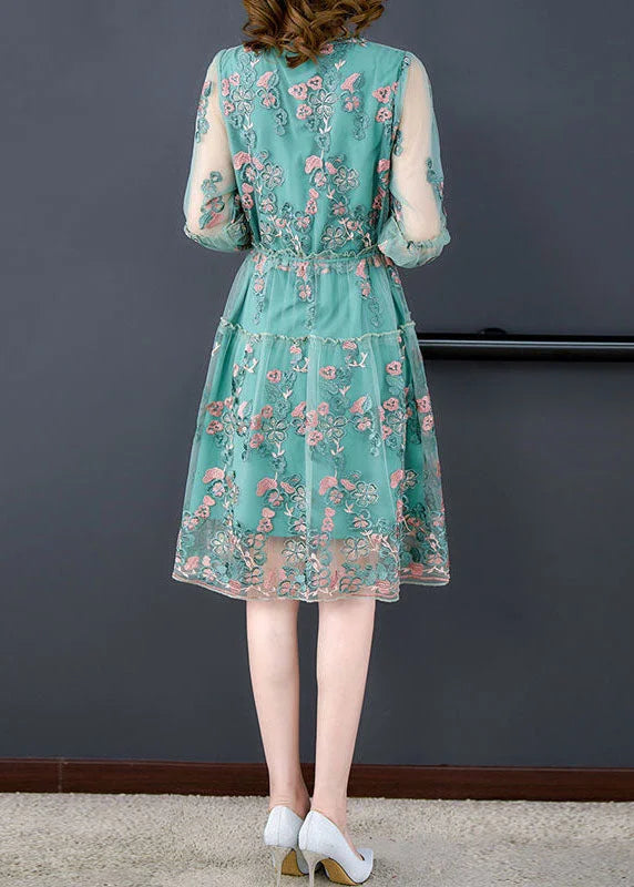 Italian Green Embroidered Tie Waist Tulle Mid Dress