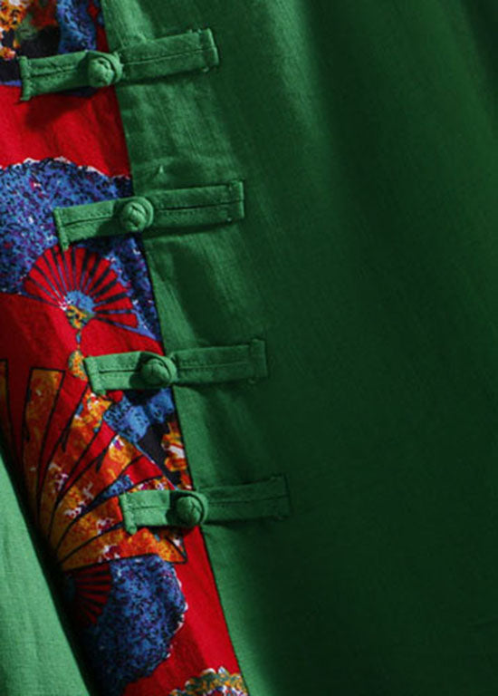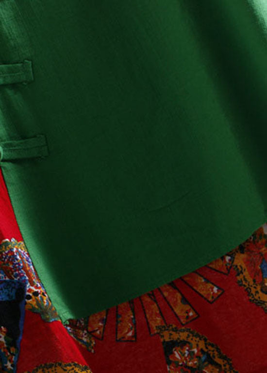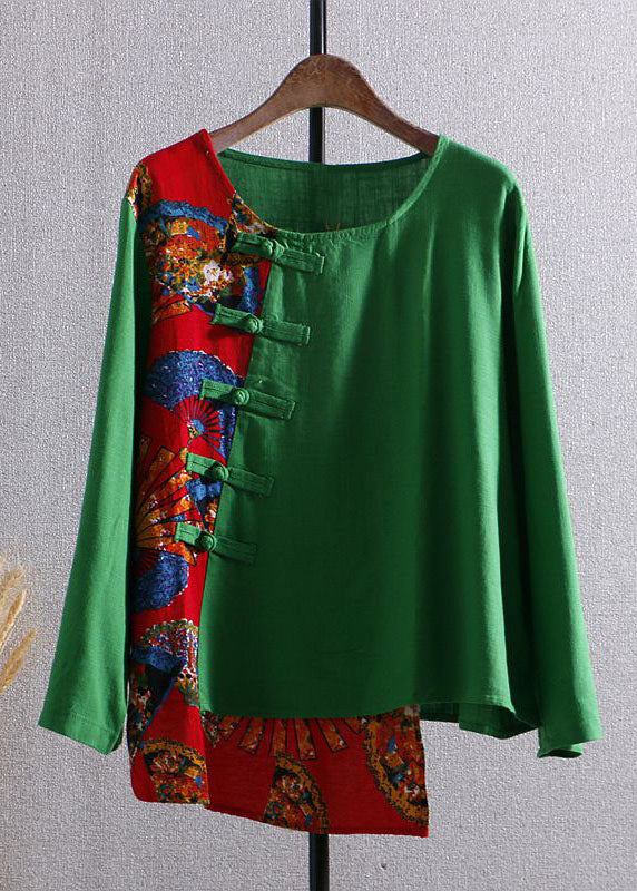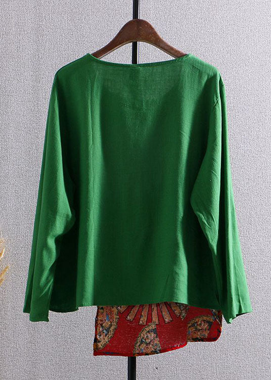 Bohemian Green Print Asymmetrical Button Patchwork Cotton Top Long Sleeve