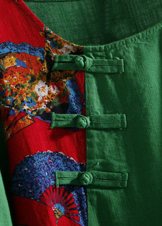 Retro Green V Neck Print Wrinkled Patchwork Linen Dress Summer