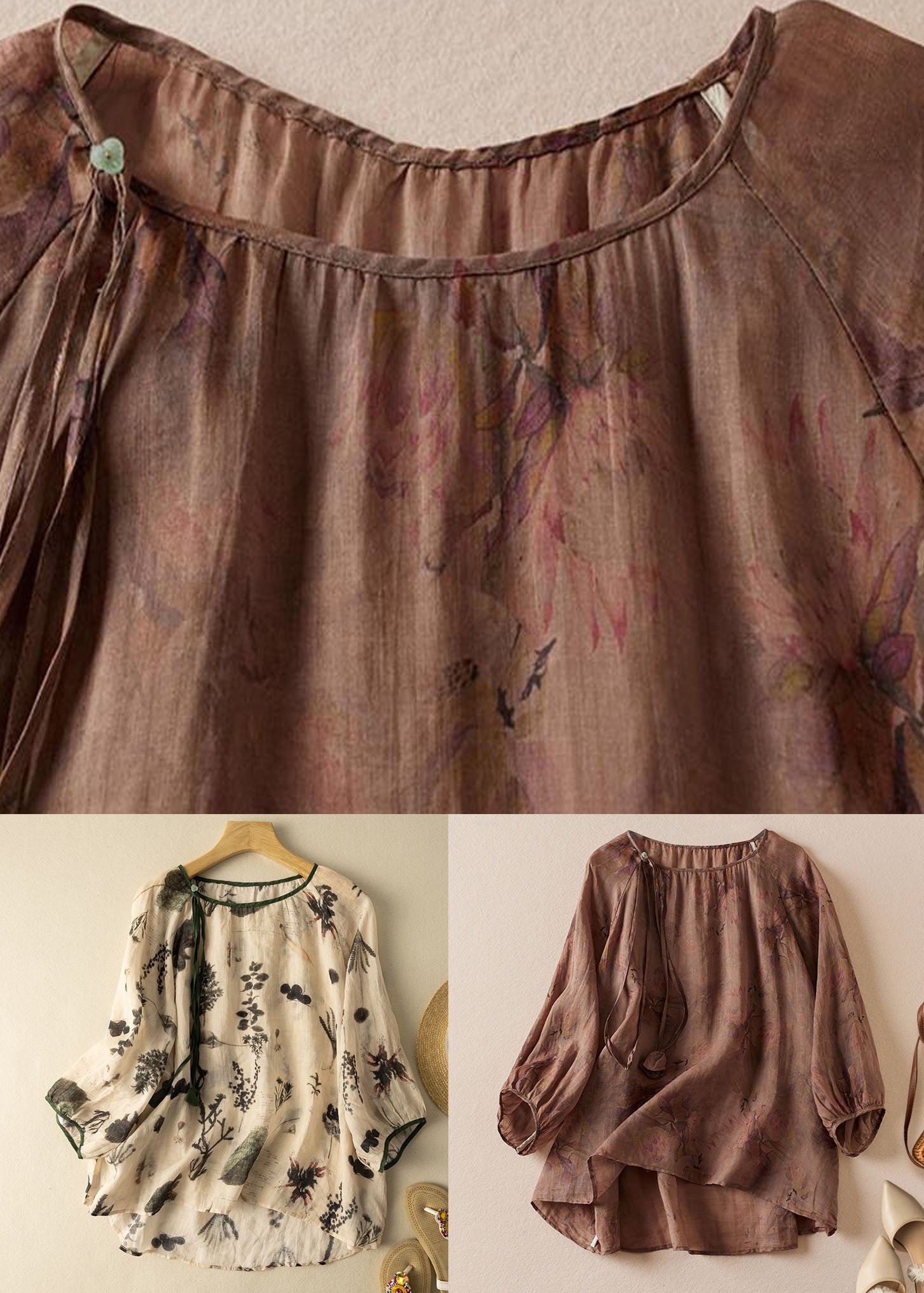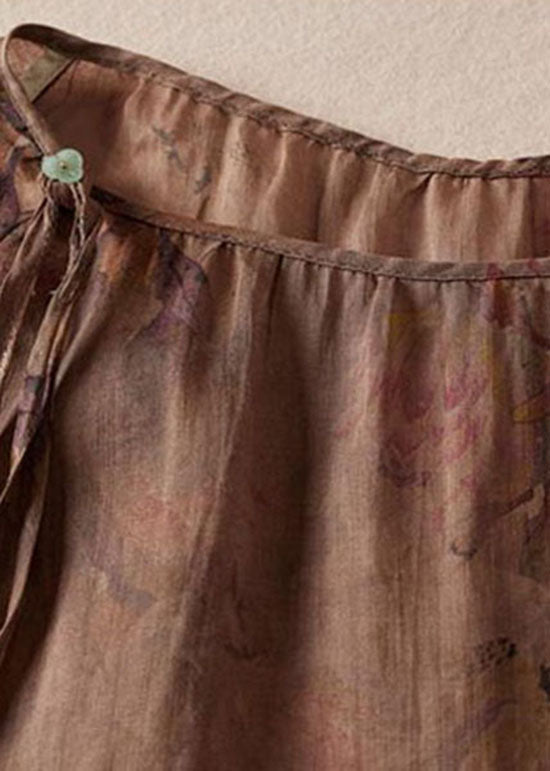 Coffee Print Patchwork Cotton Blouses O Neck Tasseled Summer