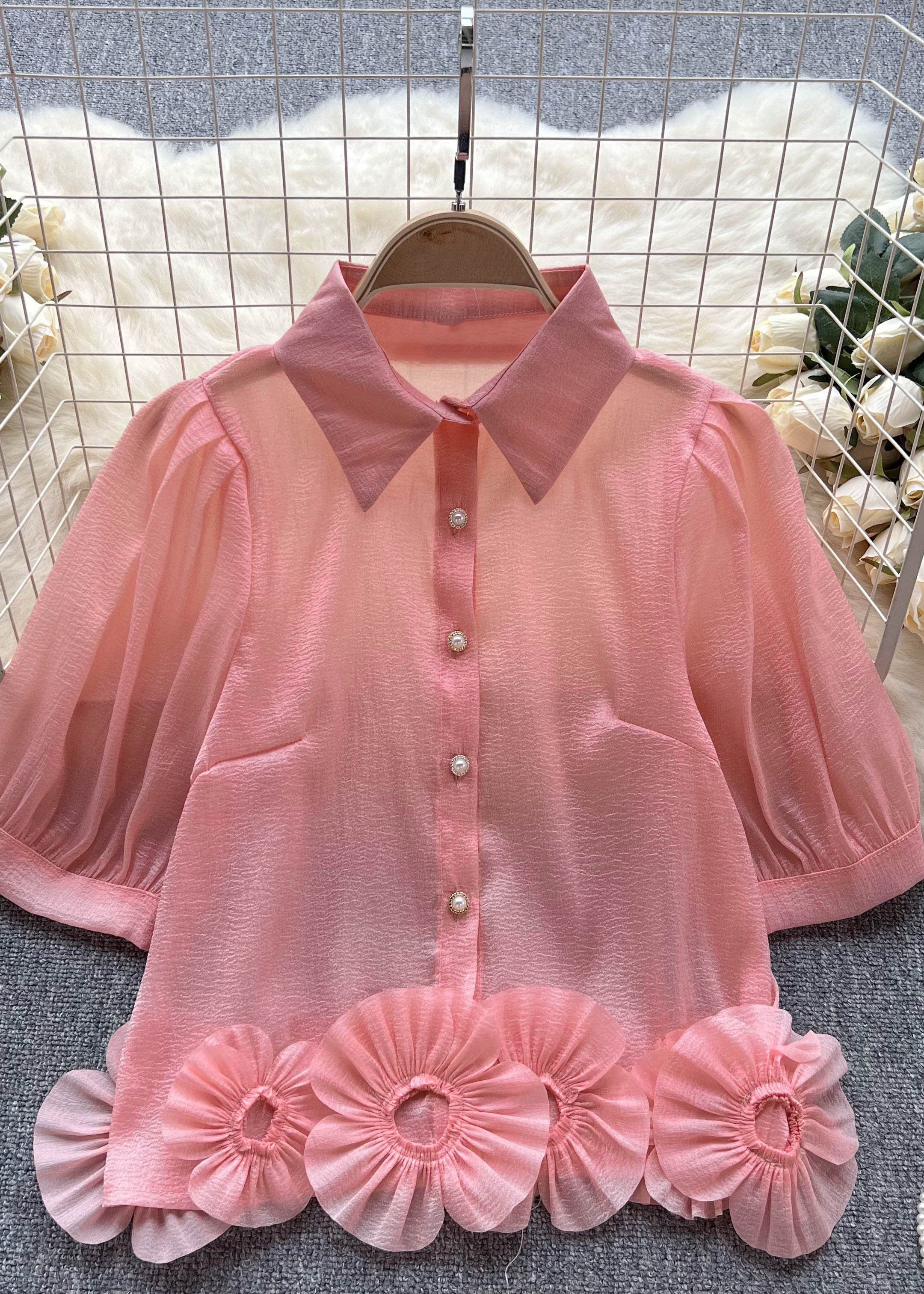 Modern Pink Peter Pan Collar Floral Patchwork Chiffon Shirts Top Summer