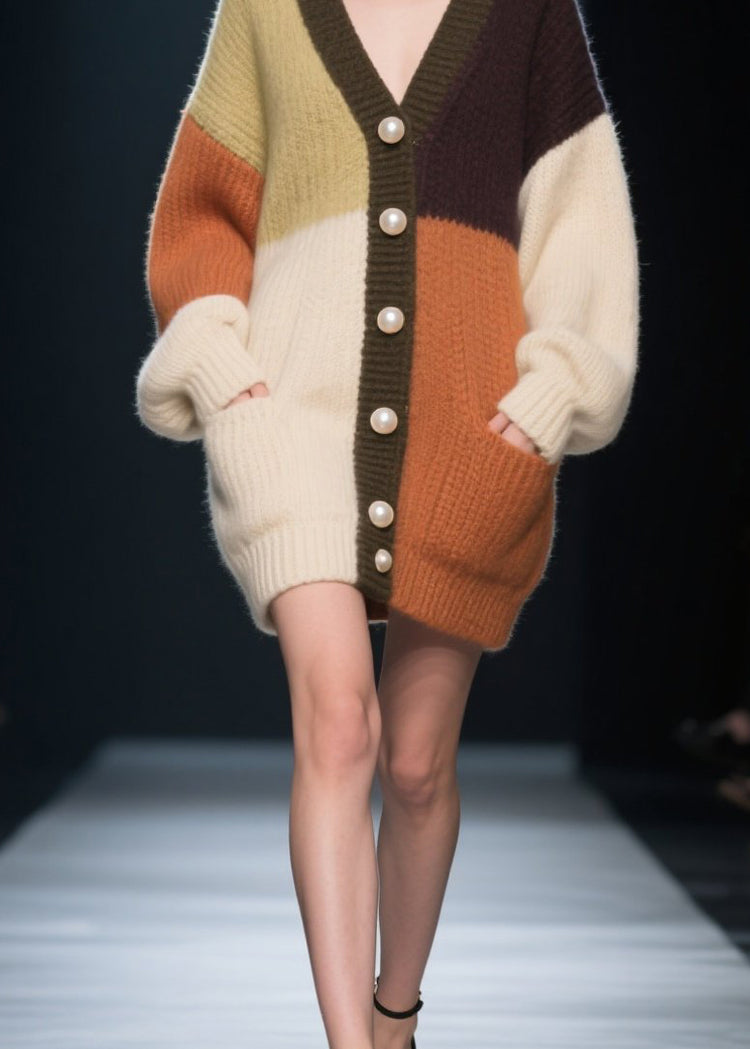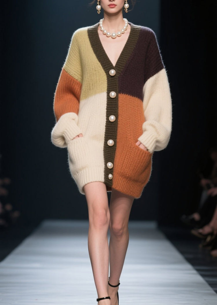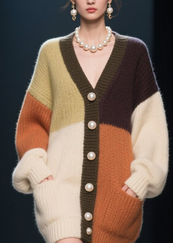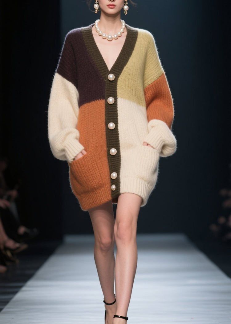 Beautiful Colorblock V Neck Button Patchwork Knit Loose Coat Fall