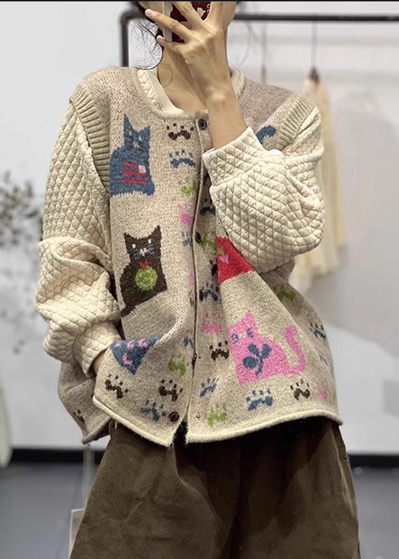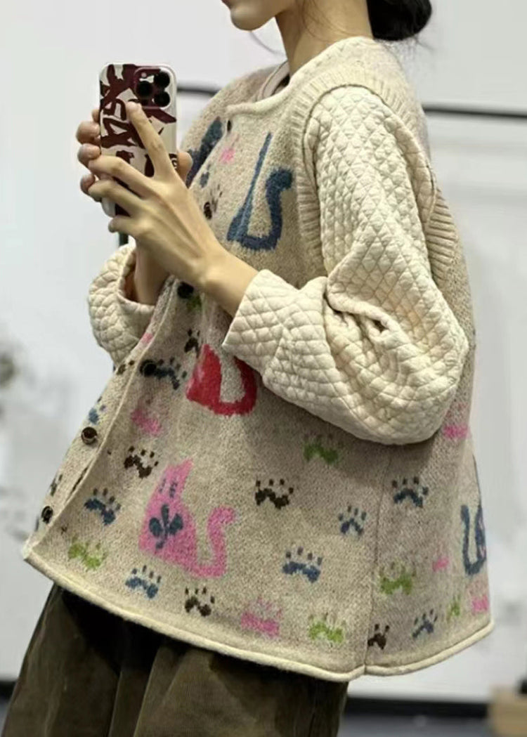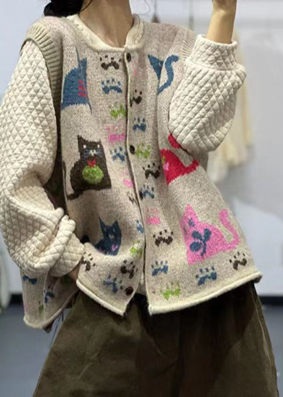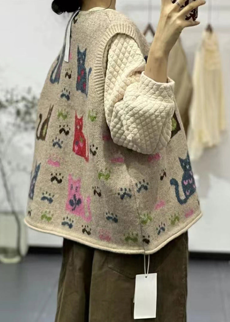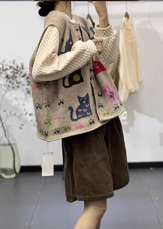 Casual Loose Apricot O Neck Button Animal Print Knit Vest Sleeveless