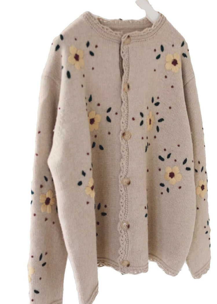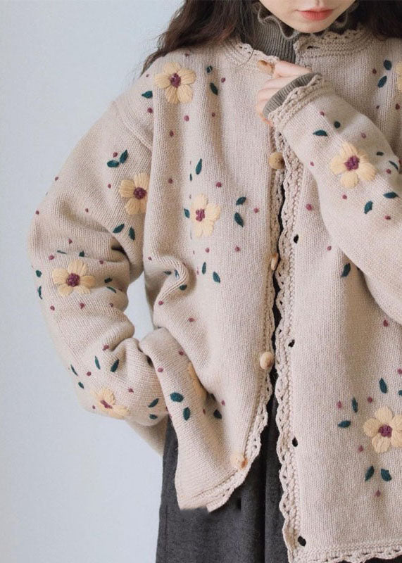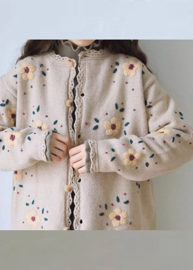 Handmade Coffee Embroideried Floral Lace Patchwork Cotton Knit Coats Long Sleeve