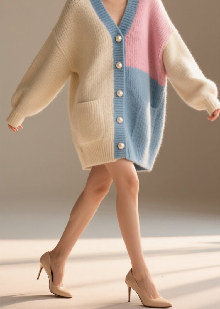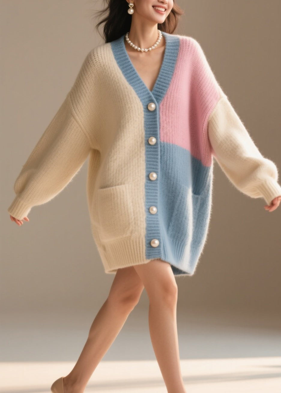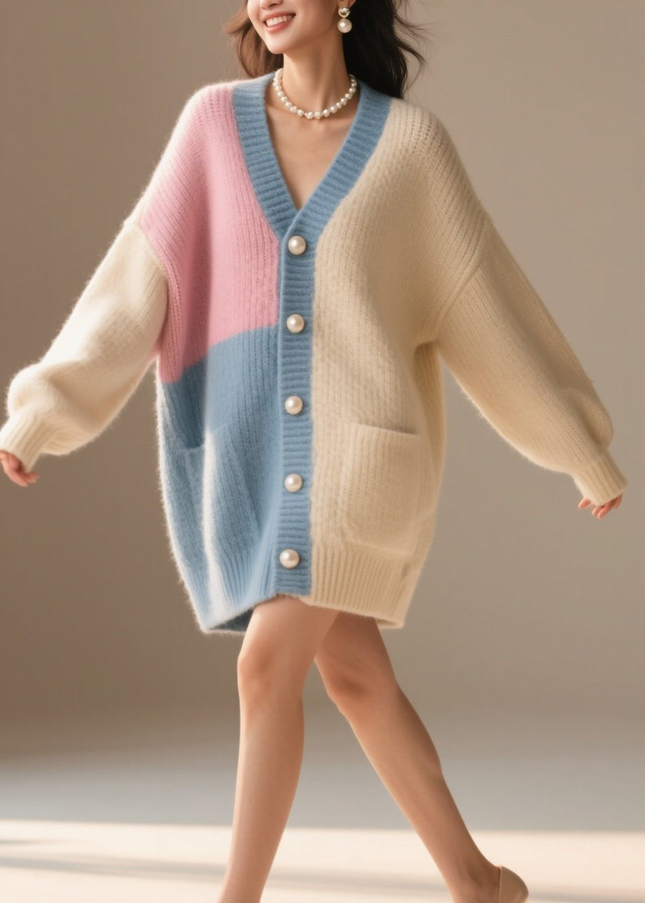 Modern Colorblock V Neck Pockets Patchwork Knit Loose Coat Fall