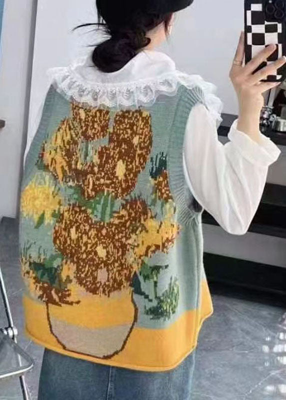 Retro Blue O-Neck Print Cotton Knit Waistcoat Sleeveless