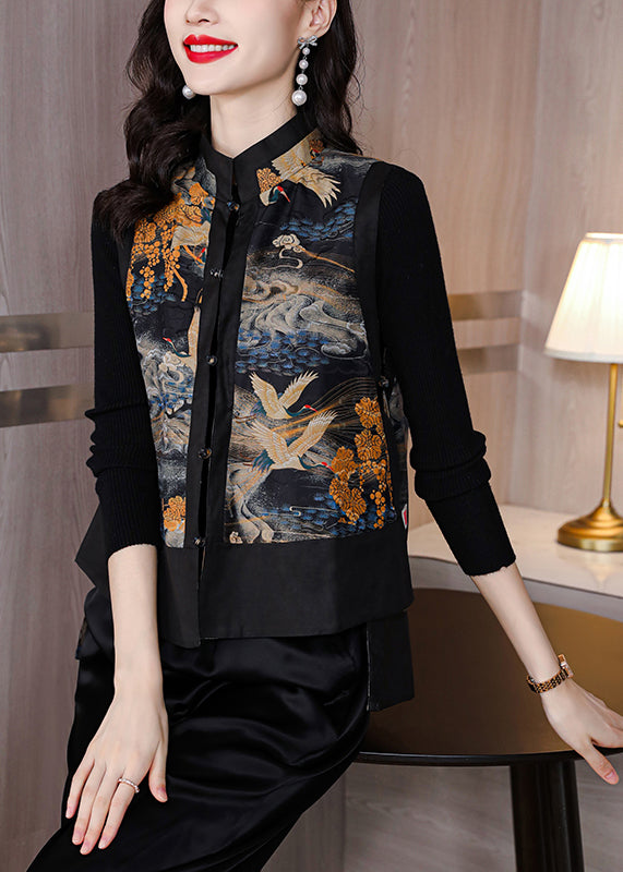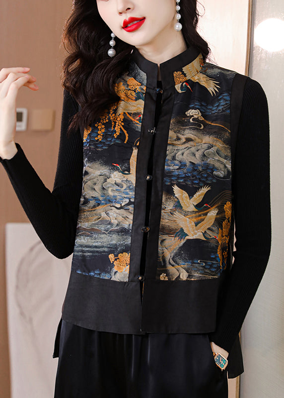 Vintage Black Stand Collar Print Button Velour Waistcoat Spring