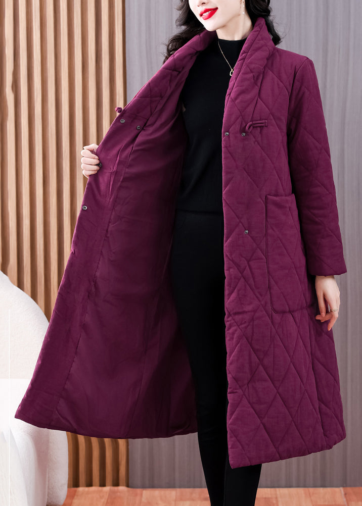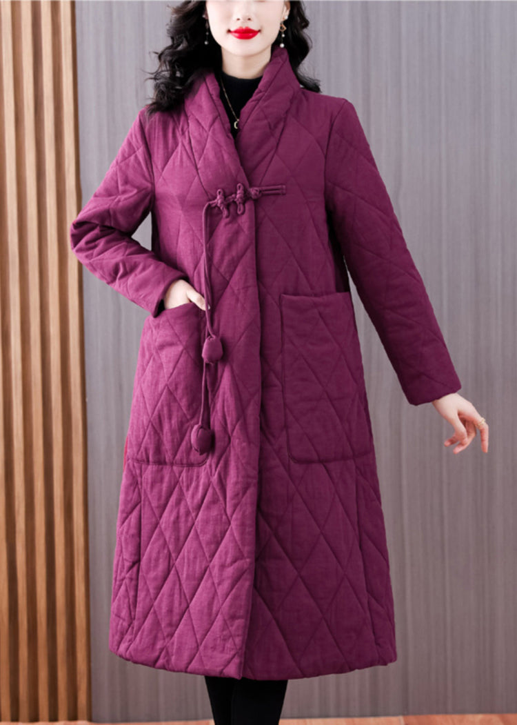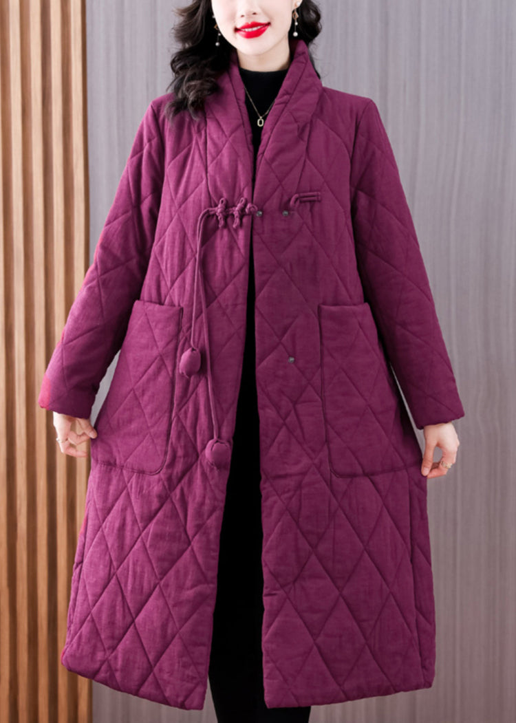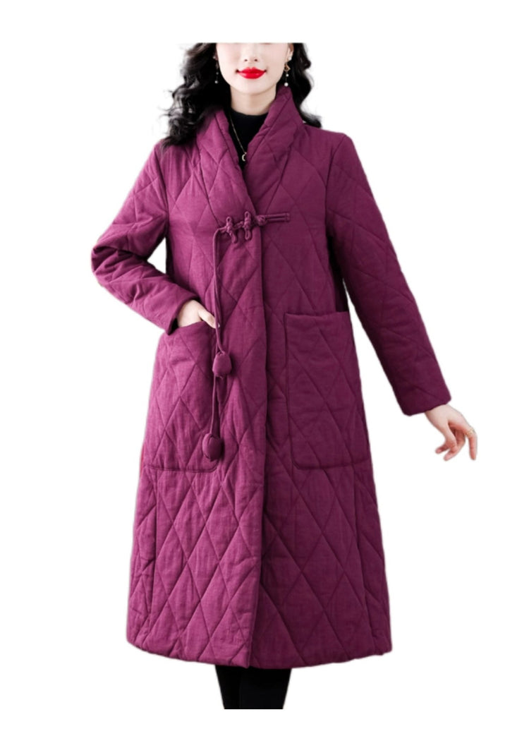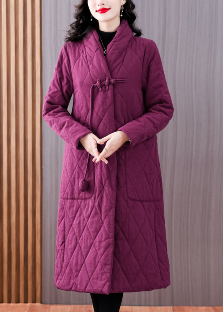 Vintage Purple V Neck Pockets Chinese Button Fine Cotton Filled Coat Winter