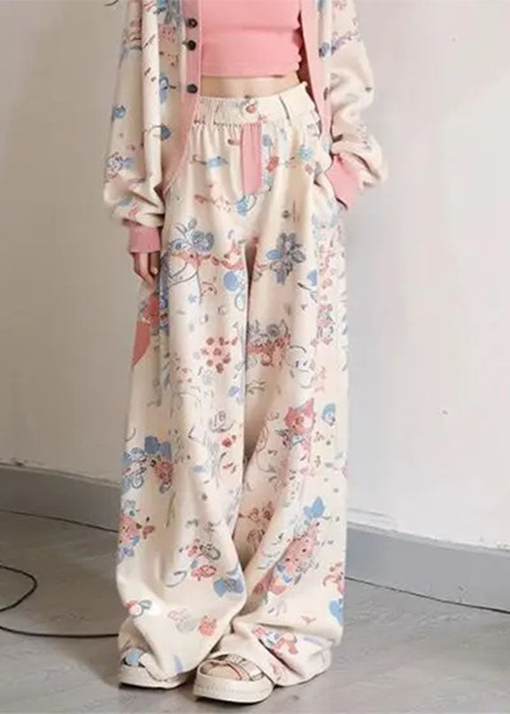 Women Apricot V Neck Print Coats Vest And Wide Leg Pants Three Pieces Set Long Sleeve