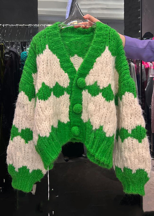 Loose Green V Neck Button Patchwork Knit Coats Fall