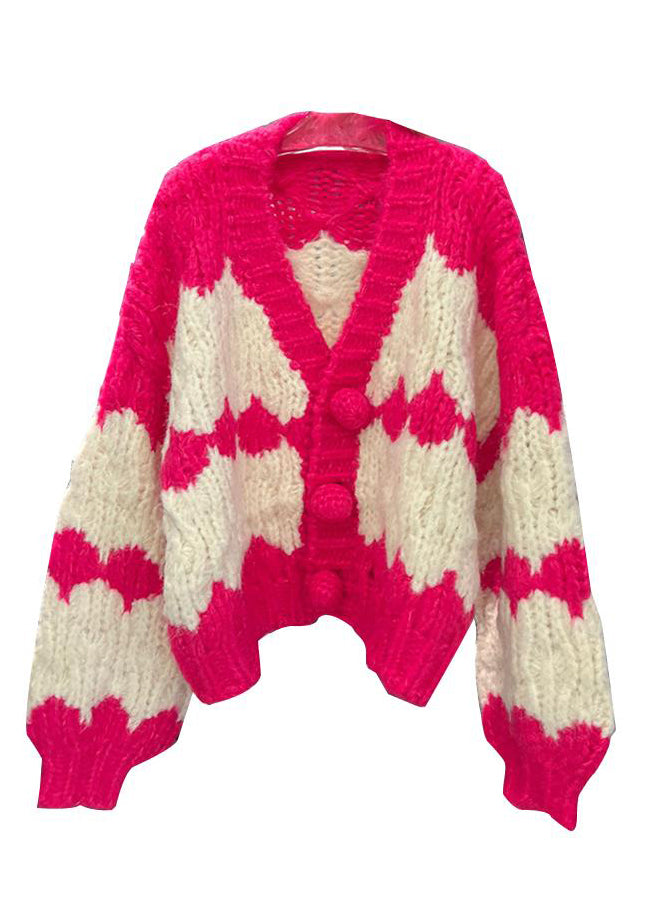 Loose Red V Neck Striped Button Cotton Knit Waistcoat Fall