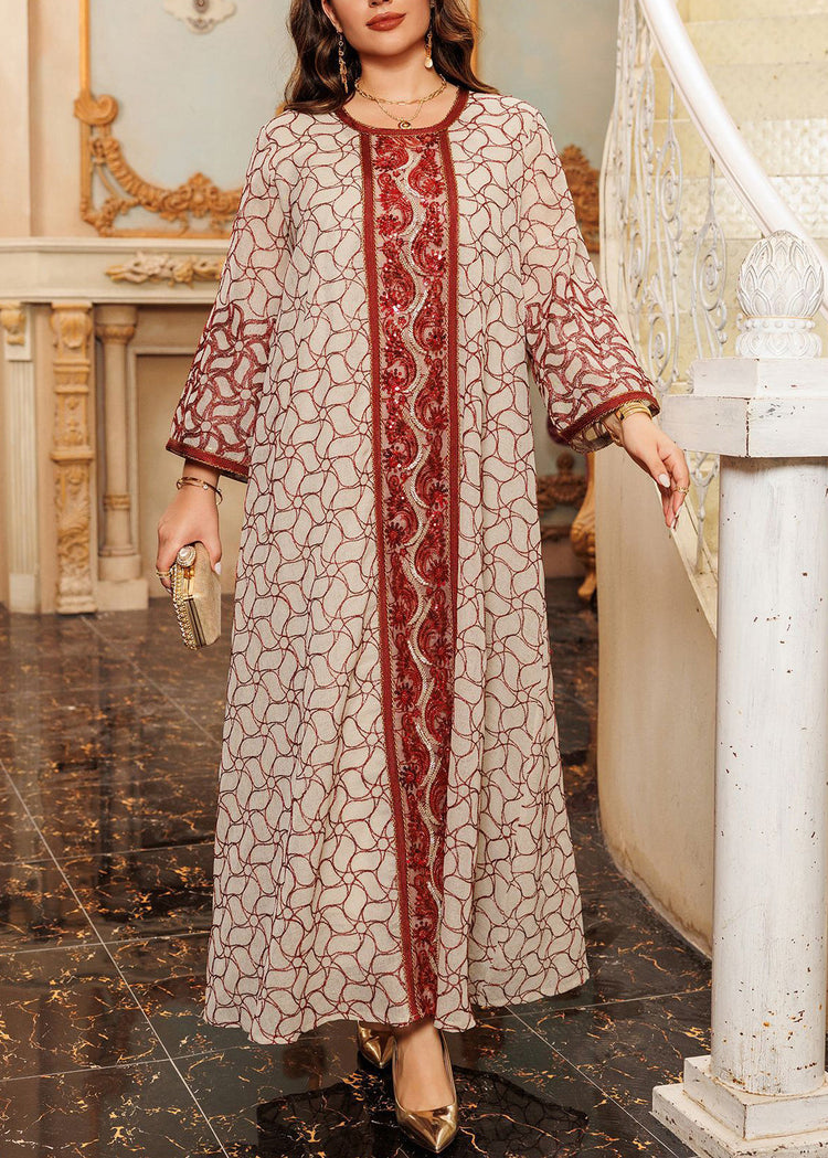 Red Embroidered Patchwork Tulle Fall Maxi Dresses O Neck