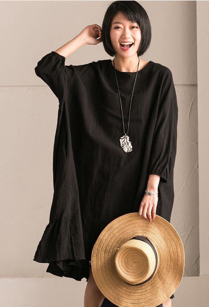 Black Korean Style Cotton Linen Bat Sleeve Round Neck Loose Dress