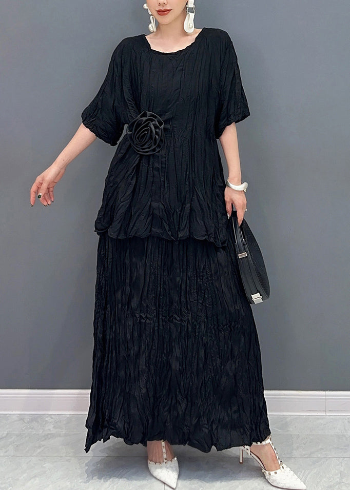 Jacquard Black Wrinkled Chiffon Long Dress Batwing Sleeve
