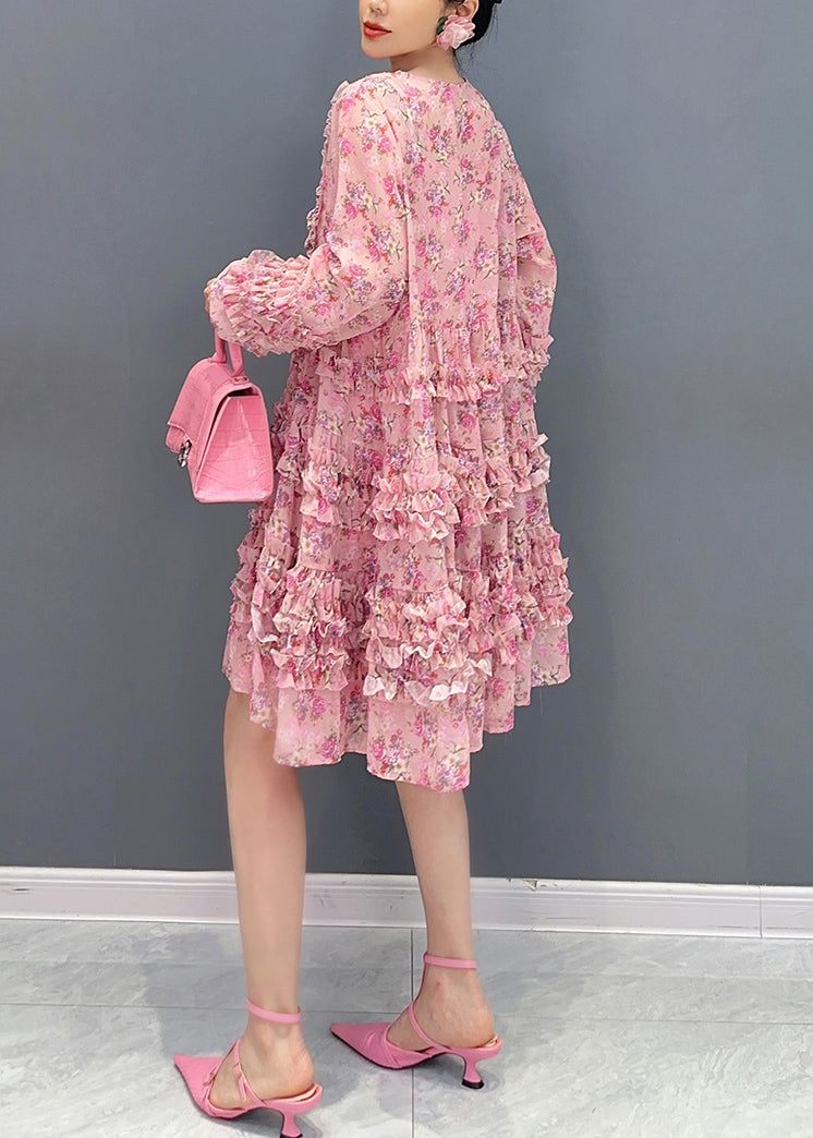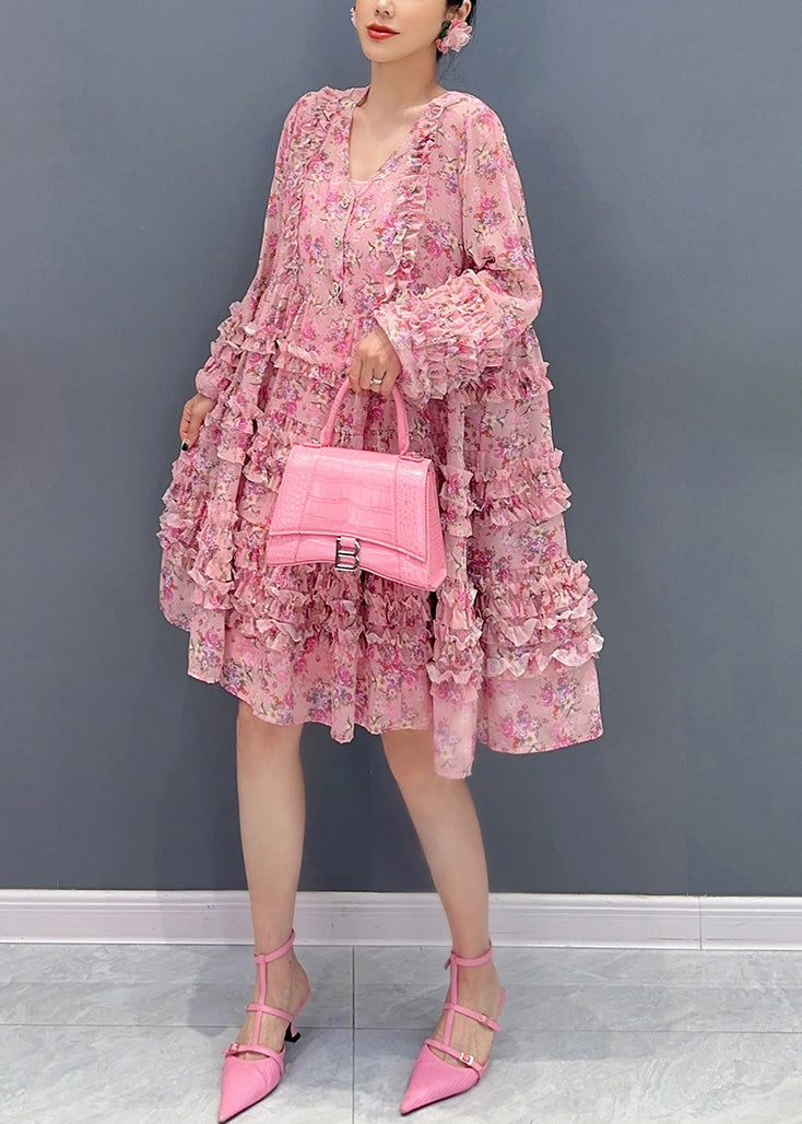 Cute Pink V Neck Ruffled Patchwork Print Chiffon Mid Dress Long Sleeve
