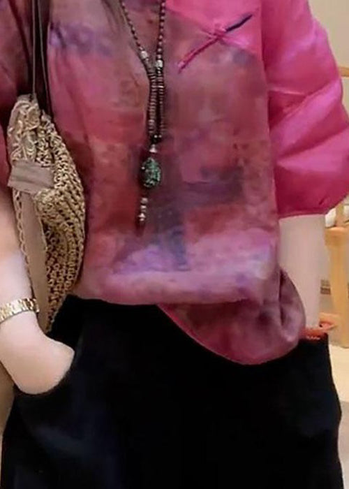 Chic Rose V Neck Print Button Linen Shirt Half Sleeve