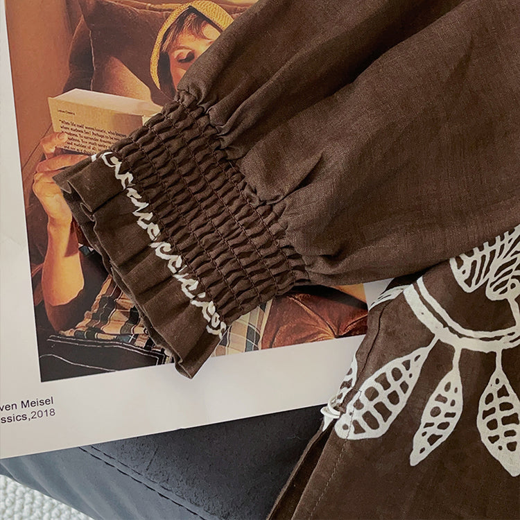 Vintage Coffee Embroidered Wrinkled Cotton Blouses Fall