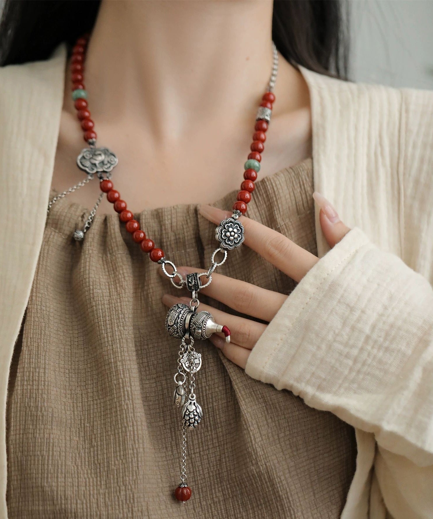 Retro Red Sterling Silver Beading Calabash Ruyi Lock Tassel Pendant Necklace