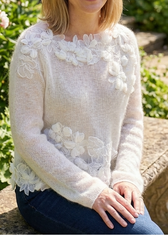 Stylish White O-Neck Floral Knit Shirt Tops Fall