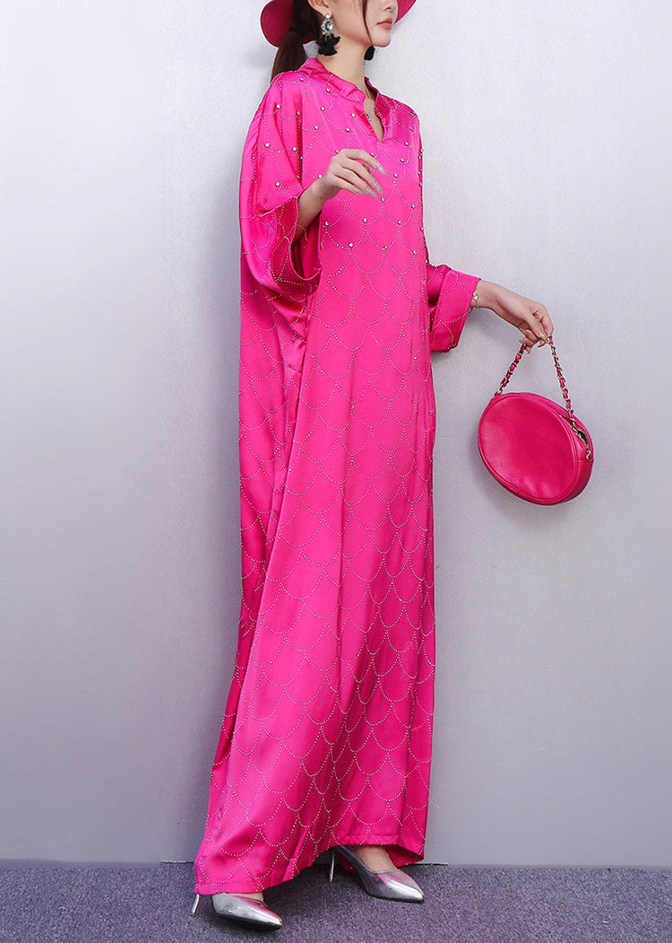 Vintage Rose Print Rhinestone Silk Vacation Dresses Batwing Sleeve