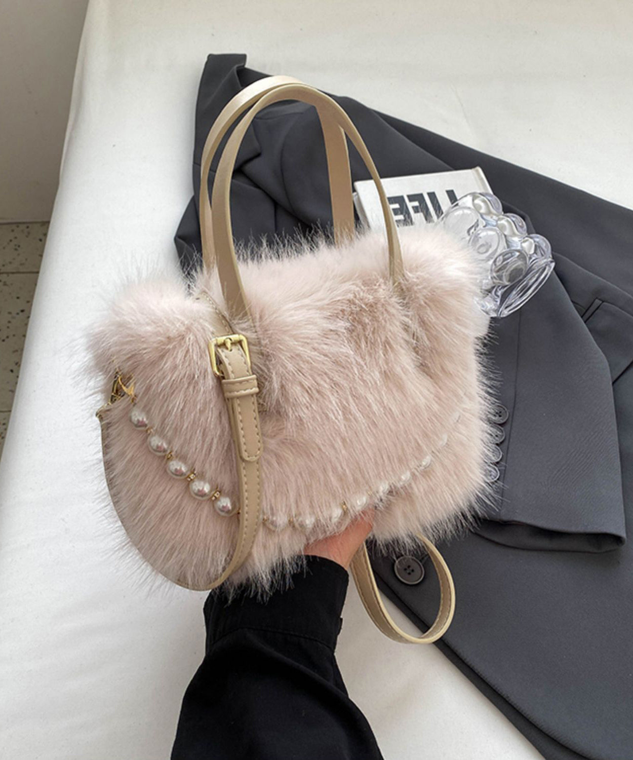New Fashion Beige Pearl Fuzzy Fur Fluffy Square Crossbody Bag