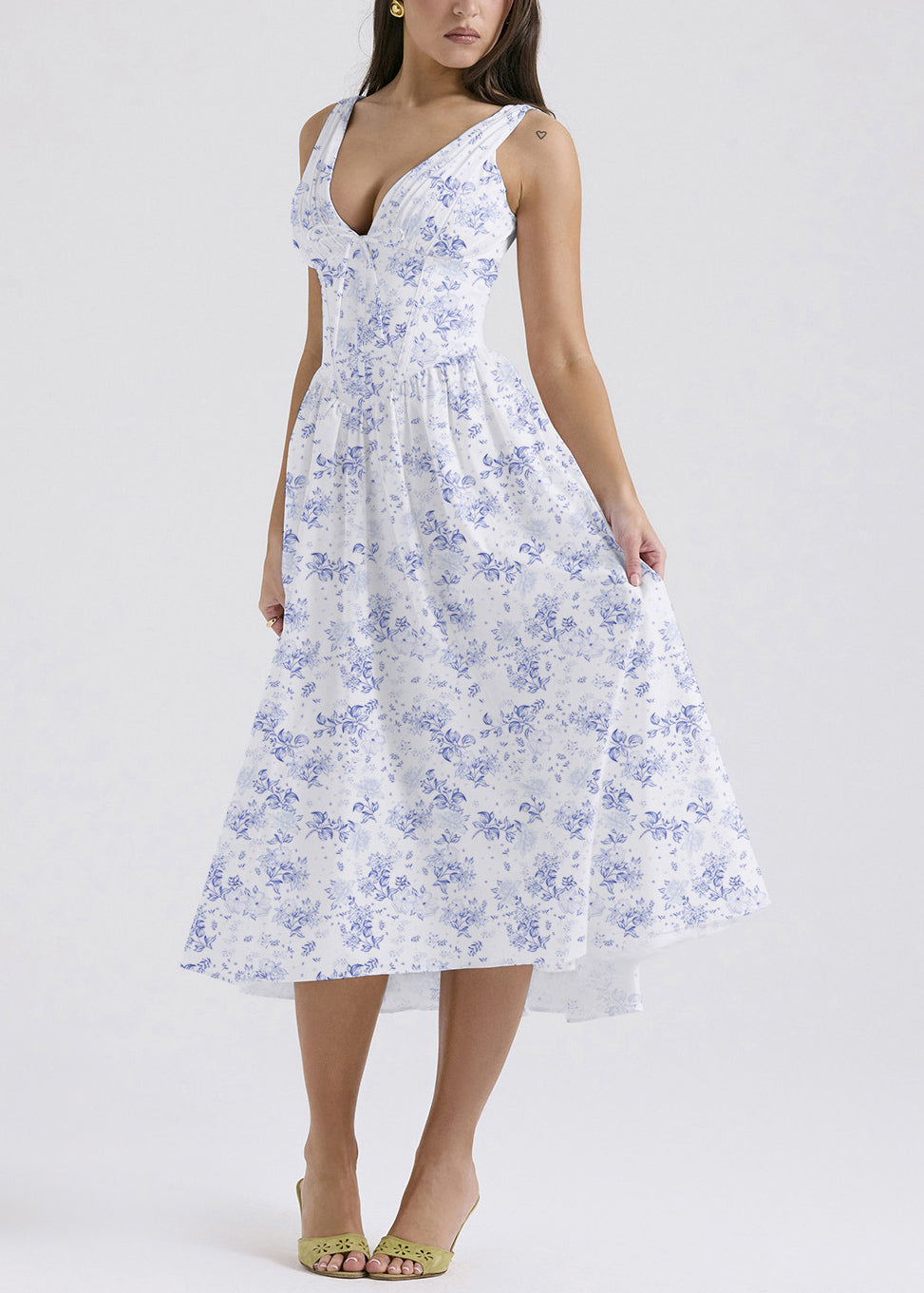 Blue Print Pockets Cotton Sleeveless Dress V Neck