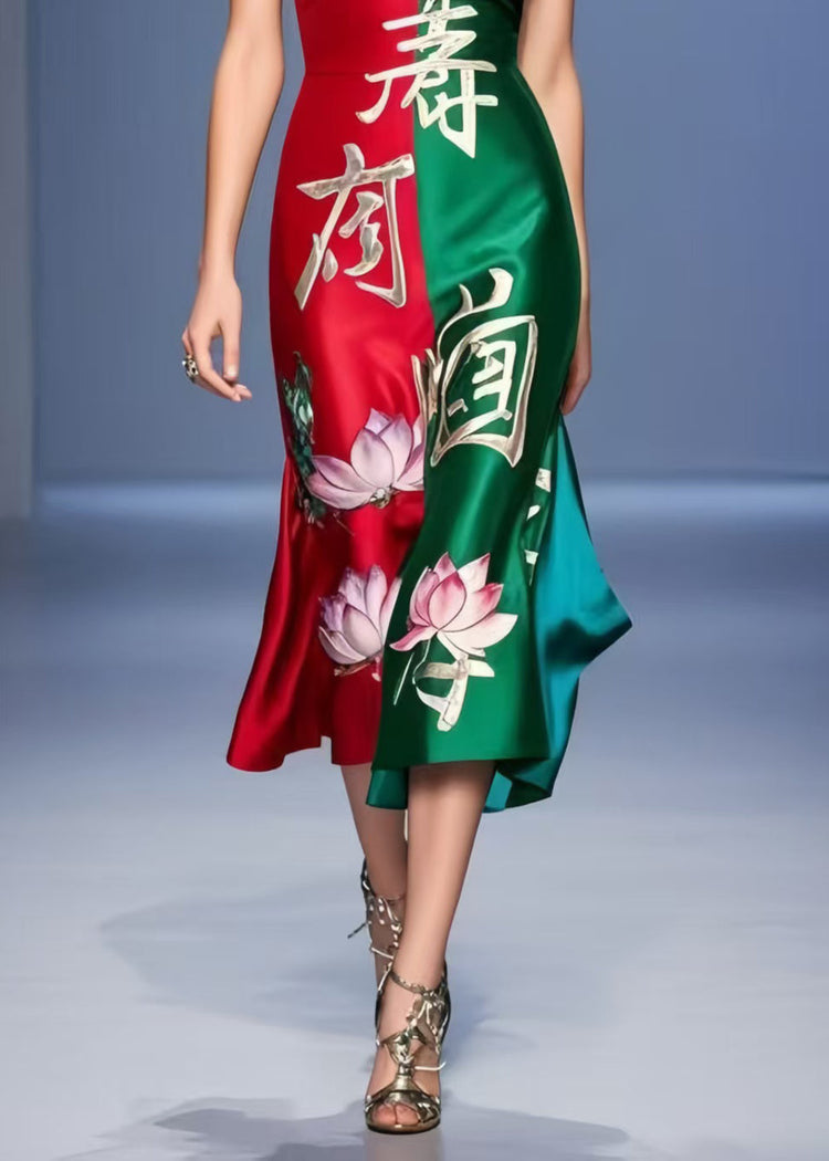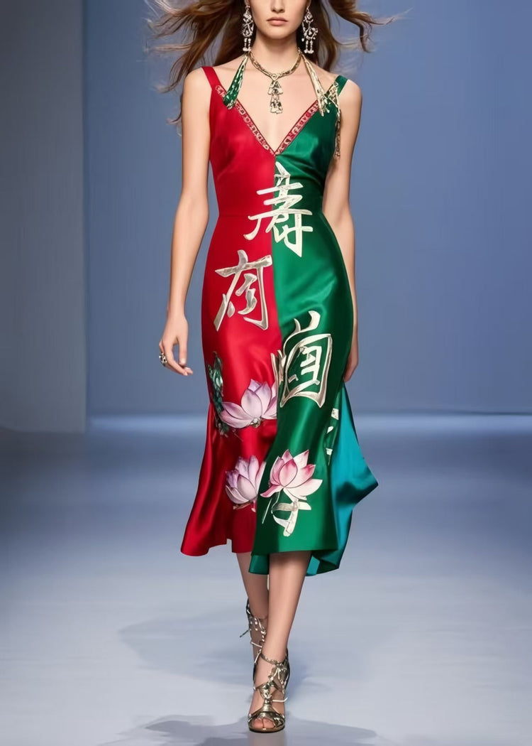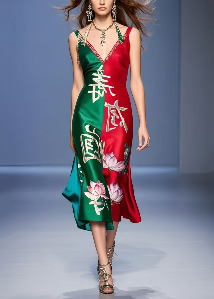 New Retro Colorblock V Neck Patchwork Silk Mini Dress Summer