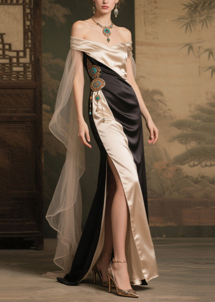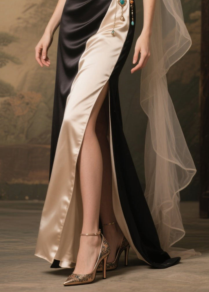 Art Colorblock Cold Shoulder Patchwork Side Open Silk Party Dress Summer