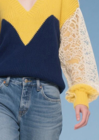 Beautiful Colorblock V Neck Patchwork Lace Knit Pullover Winter