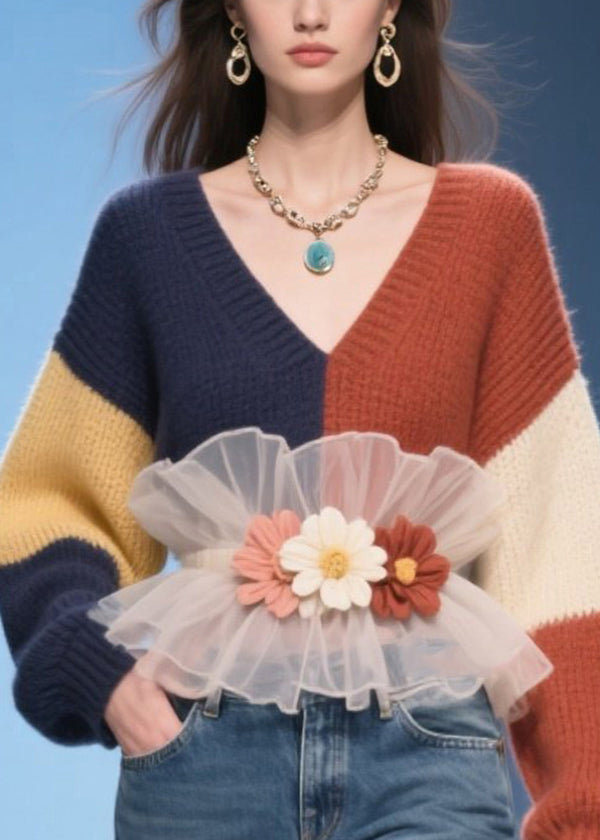 Chic Colorblock V Neck Tulle Ruffled Floral Knit Pullover Fall